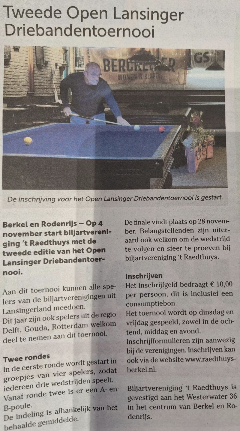 Beste Nieuwe Prins biljarters en donateurs. We gaan al weer voor de 3e keer de clubkampioenschappen houden op zaterdag 1 en zondag 2 november. Zo’n beetje het enige toernooi en de enige wedstrijden zonder handicap, dus iedere deelnemer evenveel caramboles, maar dan wel opgedeeld in poules.